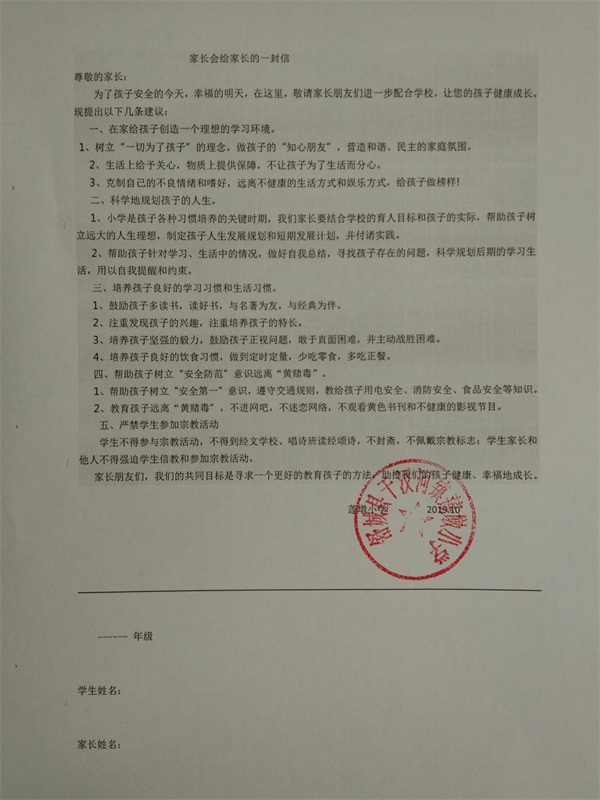 课间操时间,该校全体师生集中在操场上,校长带领学习《全县扫黑除恶专项斗争和打击整治黄赌毒违法犯罪专项行动》文件要求。同时学校开展了形式多样的活动,发动学生开展小手拉大手宣传;召开了一次专题校会、班会;再致家长一封信,信件的内容涵盖方方面面,内容具体,目标明确,要求家长远离黄赌毒。同时也帮助了孩子树立“安全防范”意识,远离“黄赌毒”,严禁学生参加宗教活动等。希望通过学校、家庭、社会共同创造一个良好的育人环境,助推孩子们健康、幸福地成长。(张让存 特约通讯员:张元纯)