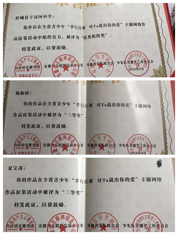 全省青少年“孝行江淮对Ta说出你的爱”主题活动落下帷幕。干汊河中学荣获”优秀组织奖“,该校杨振欣和夏宝芮两位同学荣获三等奖。