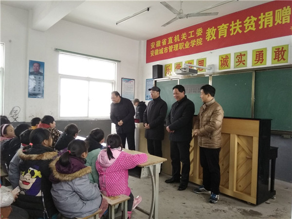 岁末年初,年关将至。为了深入贯彻国家教育扶贫政策,助力乡村小学教育脱贫攻坚工作,1月9日,安徽省直机关工委携安徽城市管理职业学院来到干汊河镇绕山小学,为该校学生资助教学钢琴、教具等学习用品,并提供专业教学支持,给贫困学生送去了节日的问候和冬日的温暖。
