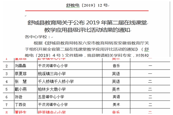 近日,舒茶镇中心小学在舒城县2019年第二届在线课堂教学应用评比中喜获佳绩。