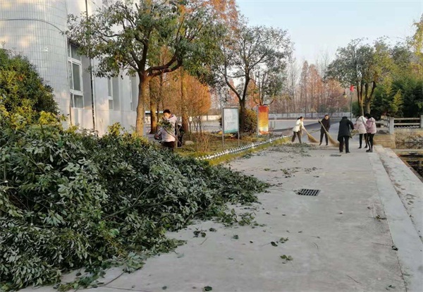 为了美化校园环境,减少校园落叶,减小厚雪压断树枝的风险,12月4日,干汊河镇中心学校组织人员对校园内的树枝进行修剪。