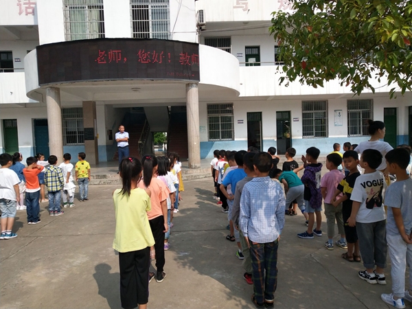 由于中心小学的操场正在修建,顾虑到学生们没有场地站立。晨读课期间,校长便和大队辅导员商量解决办法,最后决定让同学们在教学楼前的水泥路面站队。同学们面对教学楼,避开了太阳的暴晒。