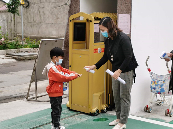 为确保幼儿园开学工作顺利进行,张母桥镇中心幼儿园多次召开全体教职工会议,精心制定方案,谋划对策,加强培训、开展演练,不断完善方案,强化细节,保障开学工作顺利进行。早晨7:30,该园所有教职员工已经布置好报到现场,进入各自岗位,疫情防控指导员和派出所民警也已提前就位,随后小朋友们陆续到达报到现场,他们沿着预设通道,保持1.5米间距逐一进行双手免洗消毒,更换医用口罩,测量体温、上交“健康登记表”和“承诺书”,逐个完成报到登记手续,然后由老师带领进入班级,重新开始了充满童趣、快乐的幼儿园学习生活。