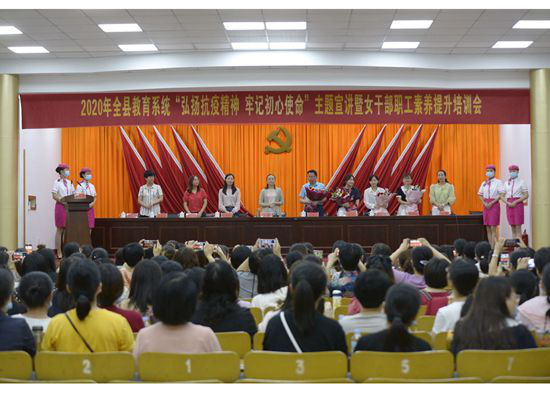 为丰富女干部职工精神文化生活,提升文化素养,加强师德师风建设,8月1日上午,我县在县政府礼堂举办了教育系统“弘扬抗疫精神 牢记初心使命”主题宣讲暨女干部职工素养提升培训会。出席会议的有县委教育工委委员、副局长王梅,县妇联发展部部长丁德燕、县网宣办主任侯贵香、县教育局机关女干部职工、学校校长、分管校长、妇工委主任、骨干教师,有300余人参加会议。教育局继续教育办公室负责同志主持会议。