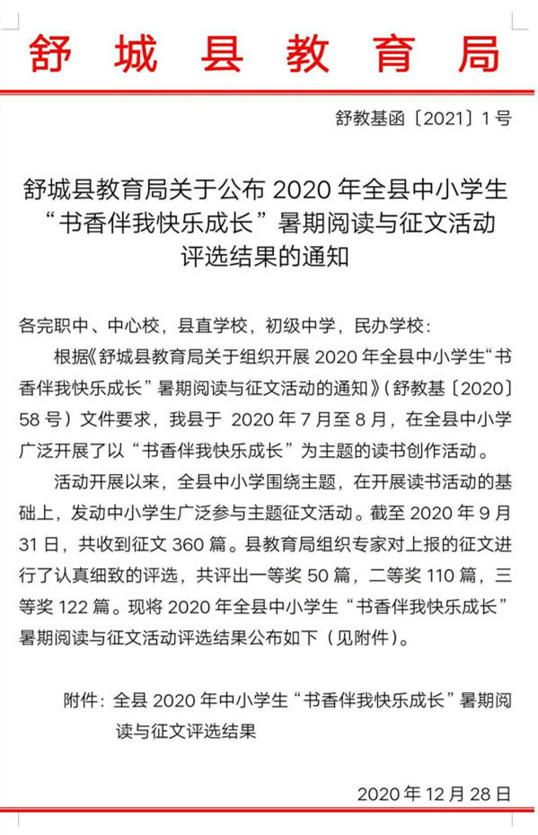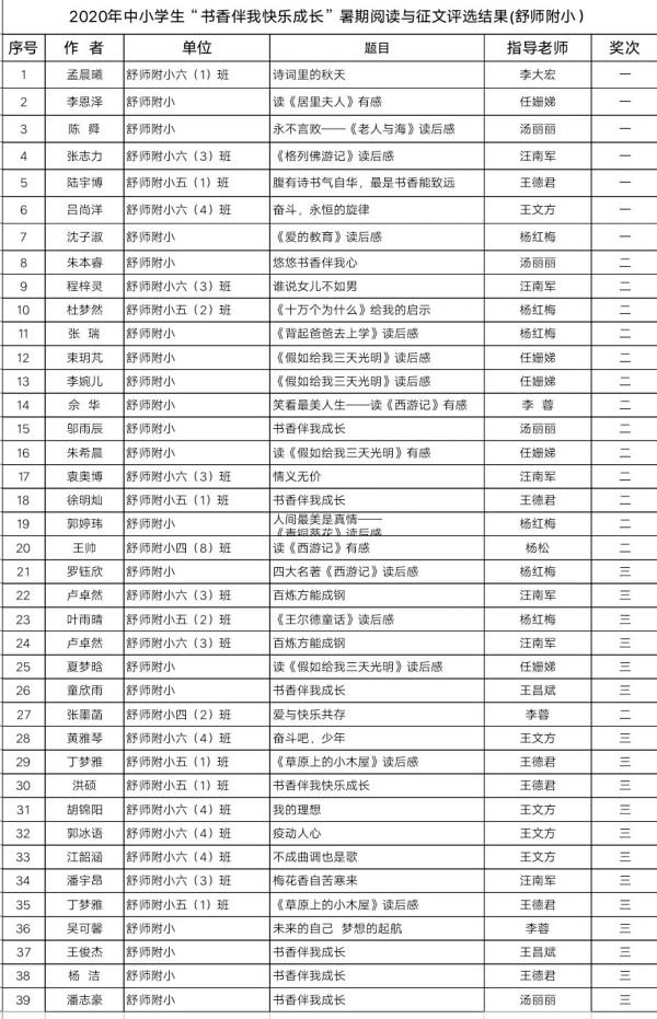 在日前公布的2020年舒城县中小学生“书香伴我成长”暑期阅读与征文活动评选结果中,舒师附小共获得7个一等奖、14个二等奖、18个三等奖的喜人成绩。