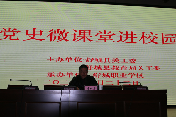 3月22日,由舒城县关工委和舒城县教育局关工委主办、舒城职业学校承办的“党史微课堂进校园”活动在舒城职业学校隆重举行。县关工委办公室主任王帮稳,县教育局关工委副主任廖自柱,县老干部服务中心王健,千人桥镇关工委副主任李传华,舒城职业学校党委副书记、副校长韦宗林、党委办主任徐丽娟、关工委办公室主任赵贤平等出席此次活动,舒城职业学校学生会干部和学生教官全体成员参加学习。
