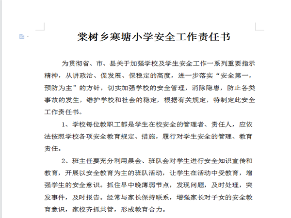 棠树乡寒塘小学制定、发放安全工作责任书