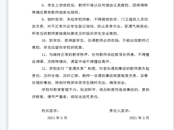 为加强学校的安全管理,消除隐患,防止各类事故的发生,维护学校和社会的稳定,棠树乡寒塘小学于3月22日制定了安全工作责任书(12条),发放给各班级和授课老师,要求学校教师和领导班子成员确实履行职责。