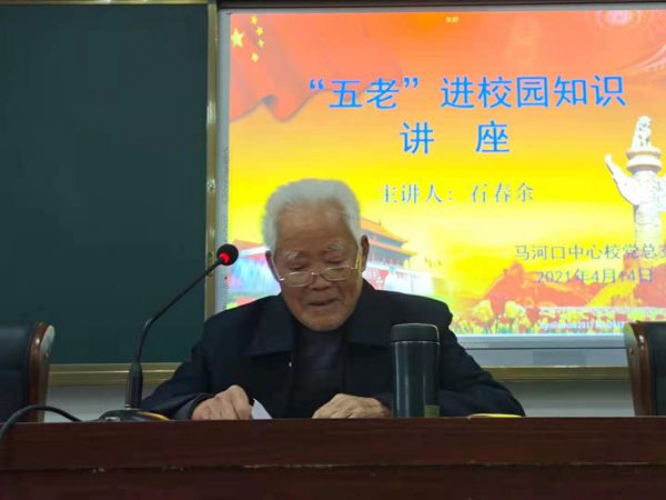 为强化校园德育建设,将爱党、爱国、爱岗敬业的情怀根植于广大教师和学生心中,充分发挥“五老”人员的余热,4月14日下午,马河口中心校邀请原中河小学退休老教师石春余给全体师生做了一堂生动的教育讲座。