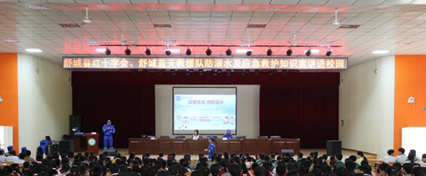 县蓝天救援队督察施胜用一个个发生在身边的鲜活悲惨的实例,一组组触目惊心的数据引起了全校师生对“防溺水”安全教育的重视。他主要从“什么是溺水、溺水的症状、如何自救与救助、如何预防溺水”四个方面进行详细的讲解,并通过播放视频的方法引导学生正确自救与救助。县红十字会办公室主任、县蓝天救援队赈济救护部部长万德年通过现场模拟“救助溺水学生”的方式,教授全体师生“心肺复苏”的急救方法,并邀请“学生志愿者”亲身体验救助的过程。同学们认真听讲,认真记录。