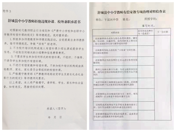 由校长任组长、校领导班成员为组员,在组长领导下,就违规补课和校外兼职等情况,开展自查、互查、督查工作。教师们纷纷自愿签订了承诺书。