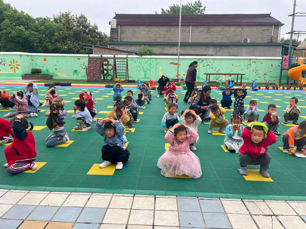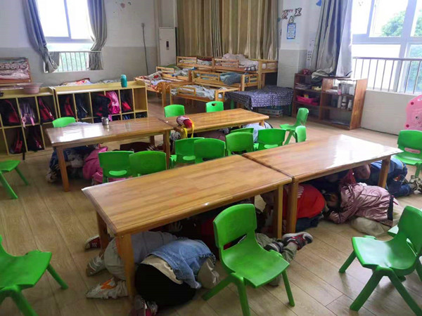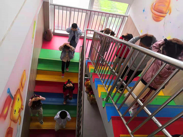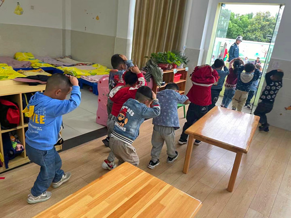 随着警报声的骤然响起,全园师生进入地震应急状态,各班教师提醒幼儿不要慌张,并指导幼儿双手护头、蹲在课桌下或教室墙角。各班教师组织幼儿按照规定线路迅速地撤离教学楼到操场安全地带“避险”,孩子们快速集合,各班老师清点人数,全园幼儿安然无恙。在大家的共同努力下,整个演练过程中,现场秩序井然,幼儿情绪稳定。